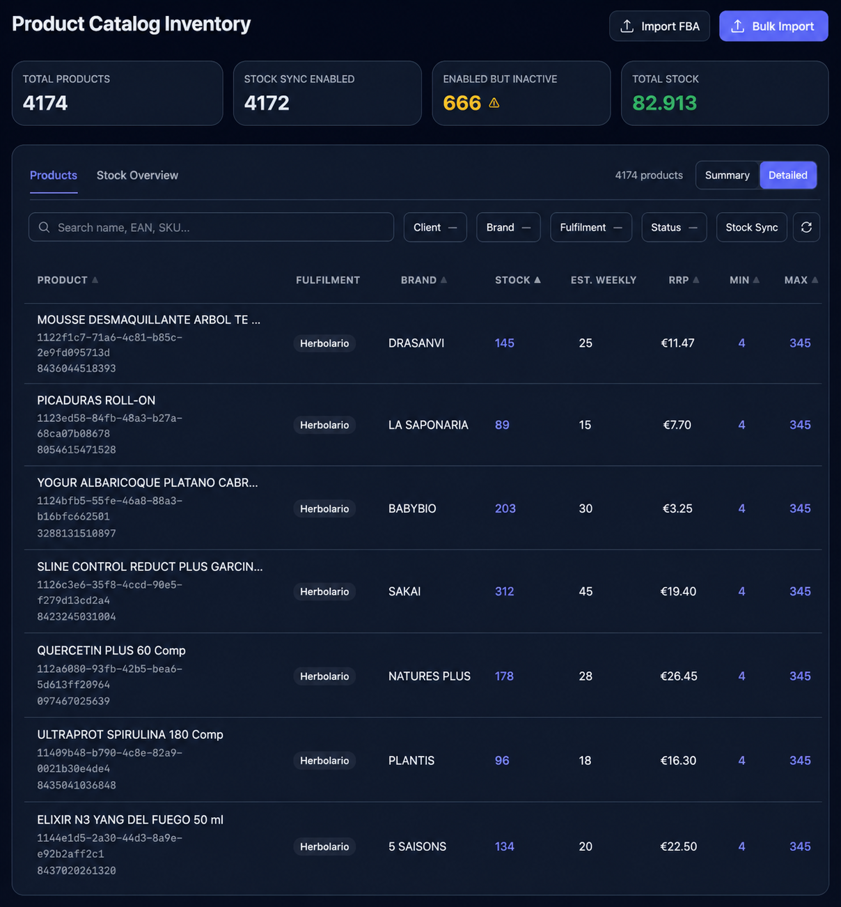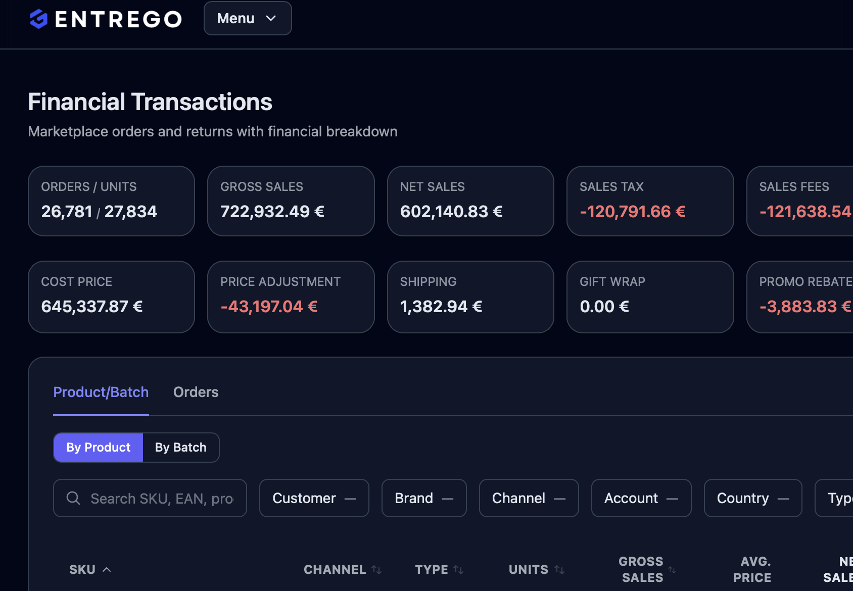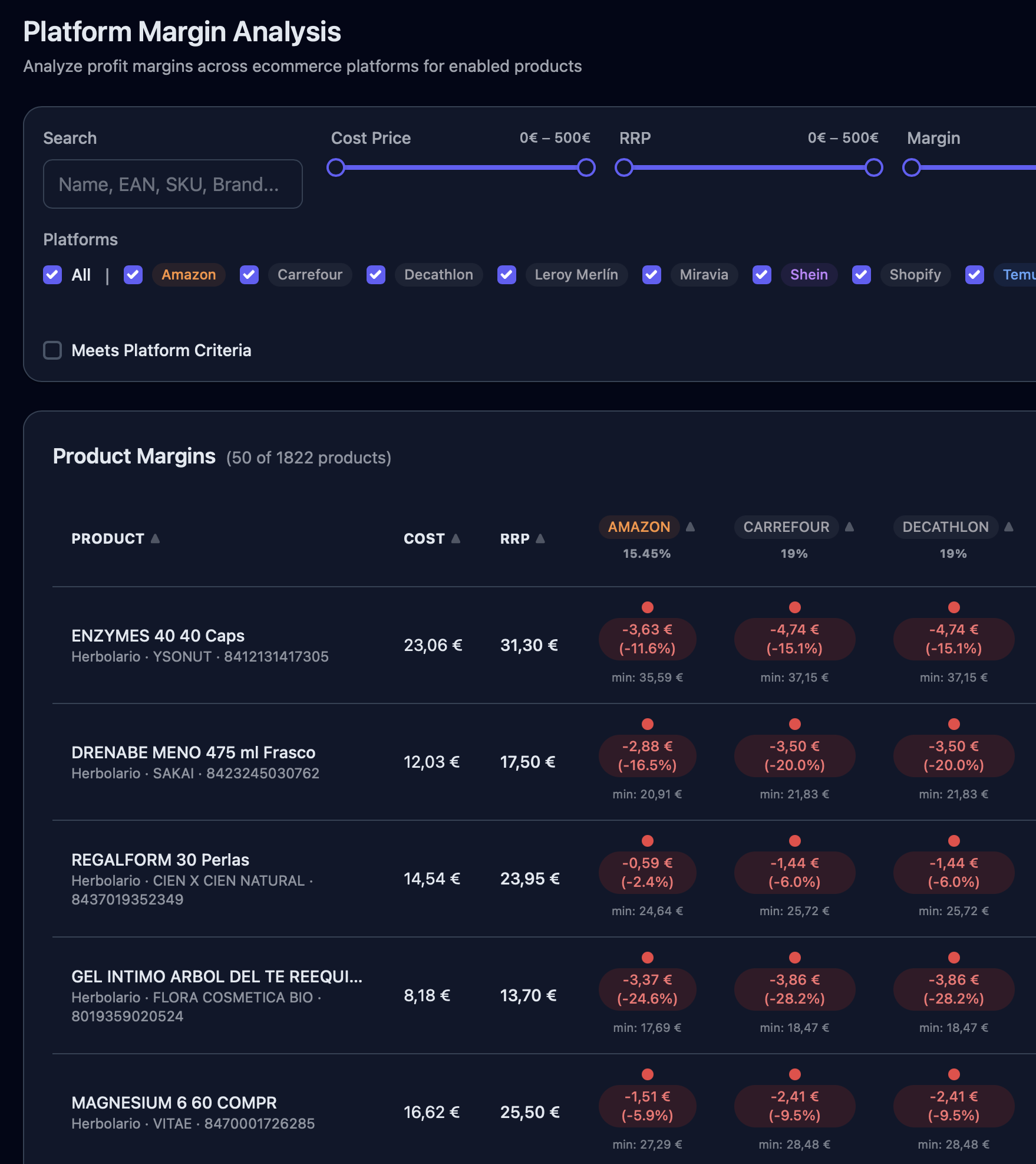 Aquí está la diferencia que ningún otro 3PL te ofrece. Nuestra plataforma cruza tus ventas con los costes logísticos reales, las comisiones de marketplace, las devoluciones y los gastos de envío para darte el dato que de verdad importa: tu margen real por producto, por canal y por periodo.
