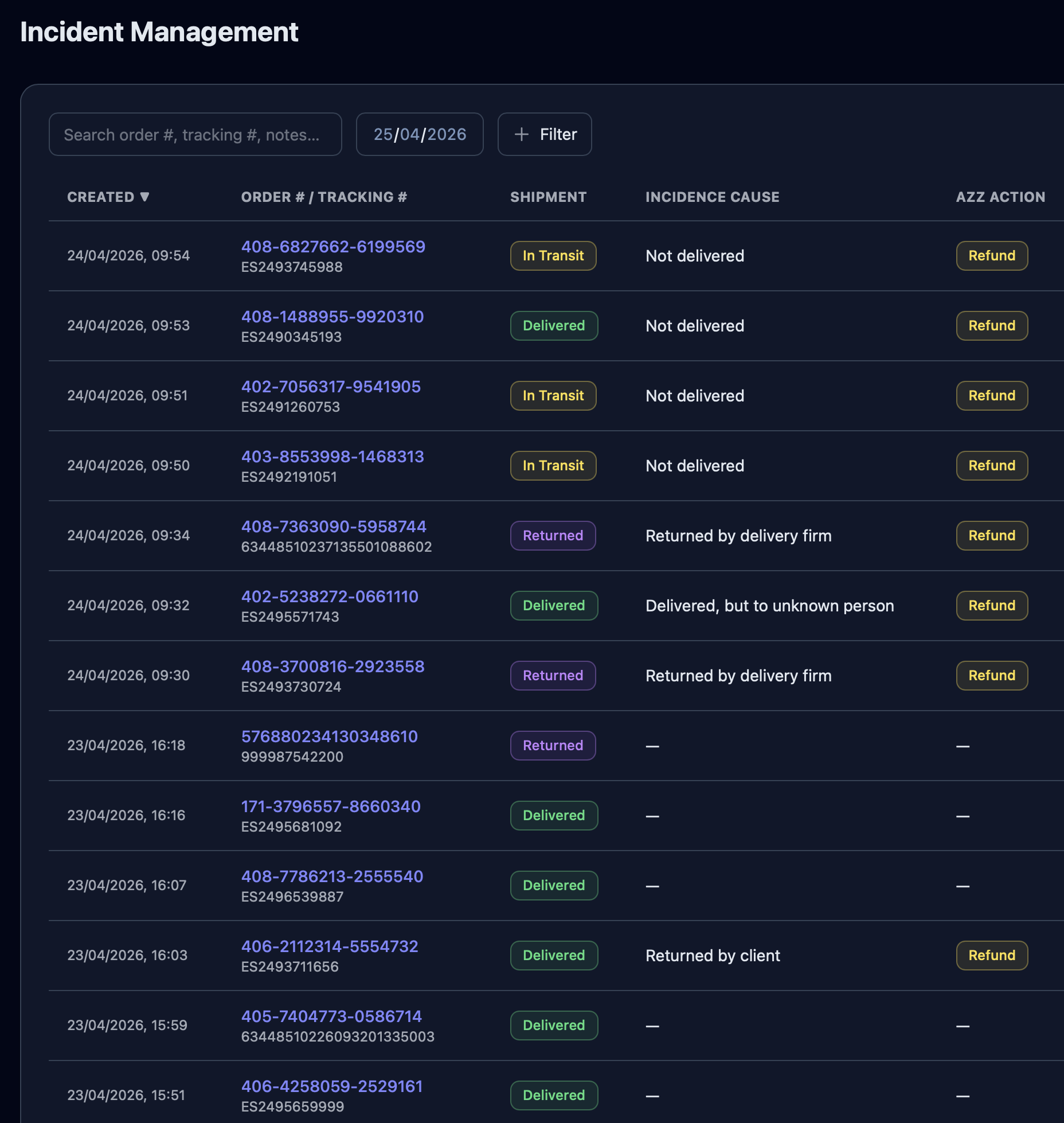 Pedidos entrantes, pedidos salientes, incidencias y stock en tránsito en una sola pantalla. La trazabilidad completa de cada movimiento, con histórico, alertas y resolución de incidencias dentro de la misma plataforma.